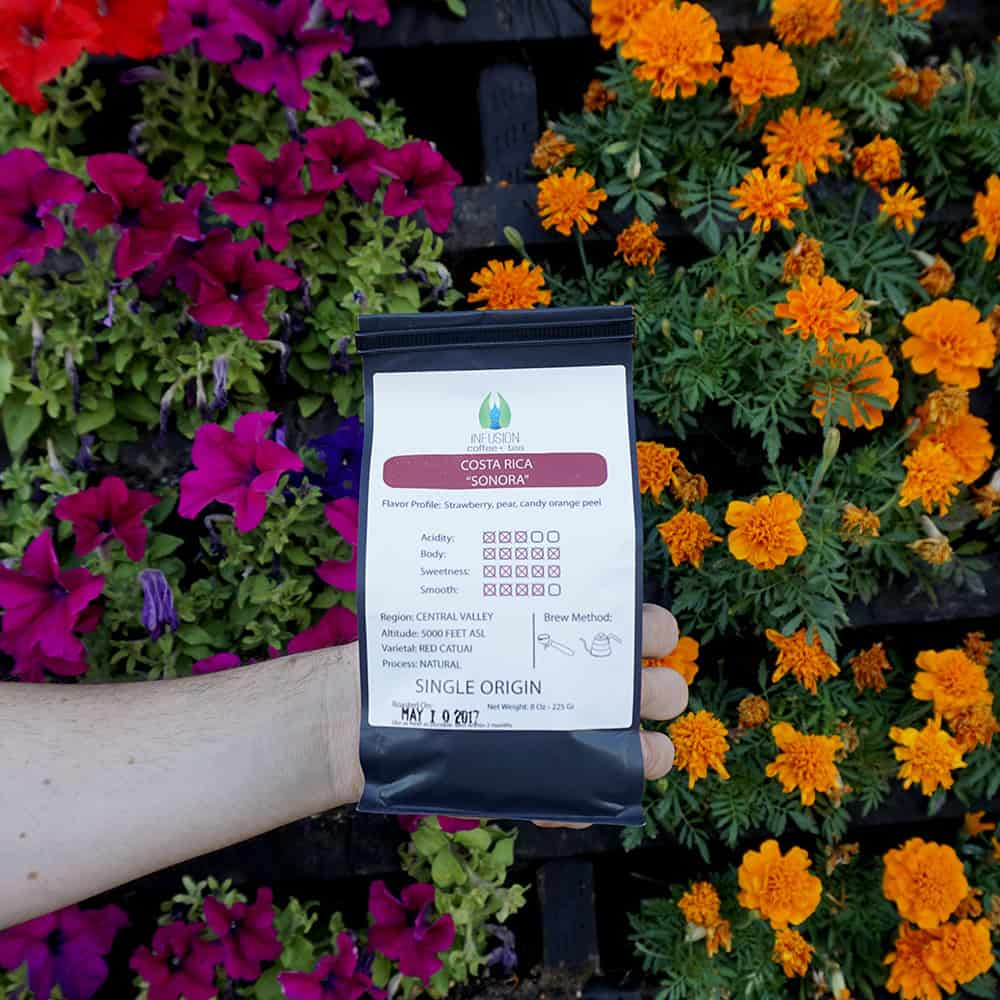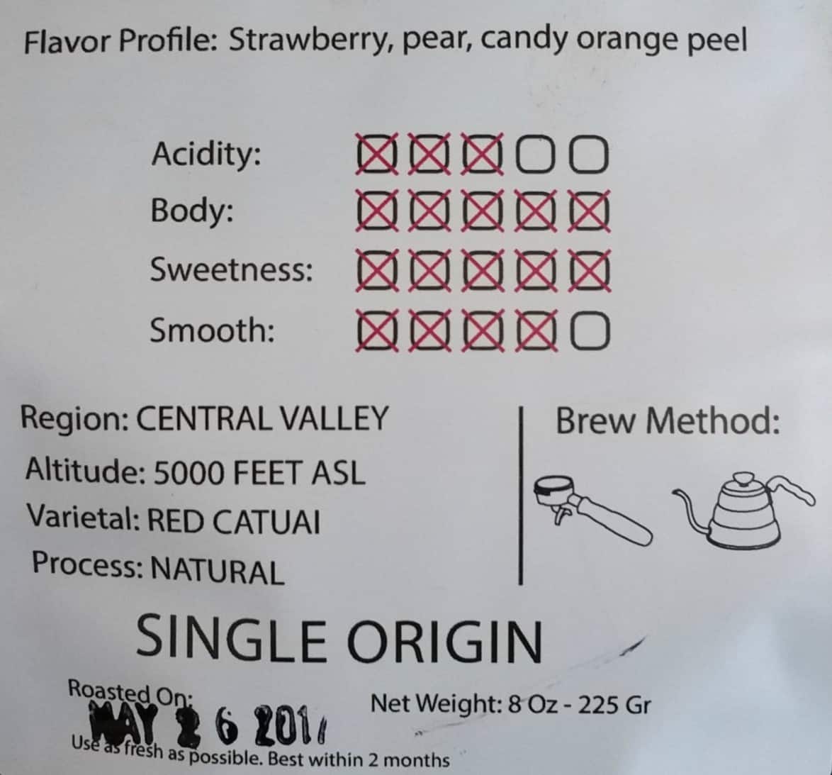 -225 grams of red catuai from Costa Rica with notes of strawberry, pear and candy orange peel