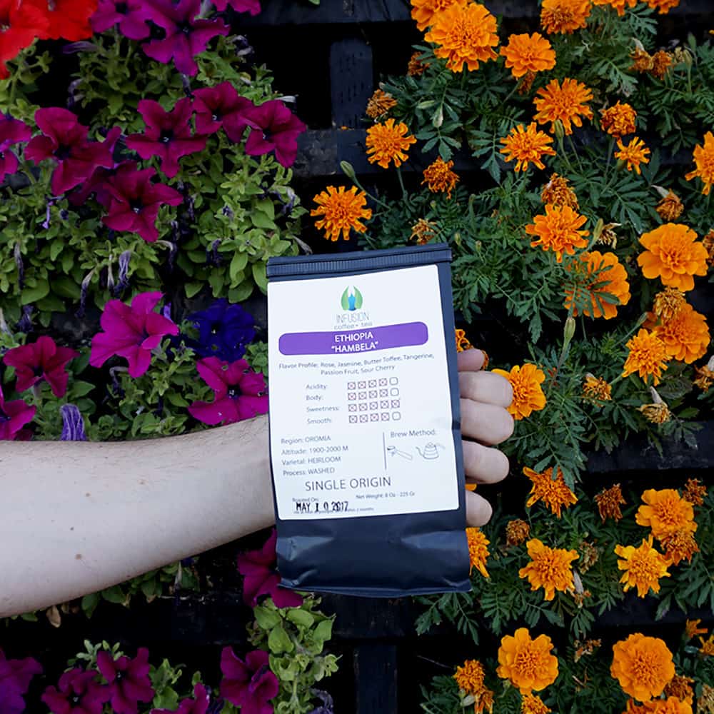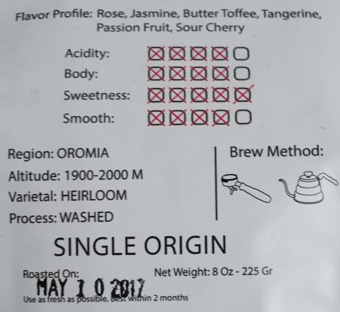 -225 grams of heirloom from Ethiopia with notes of rose, jasmine, butter toffee, tangerine, passion fruit and sour cherry